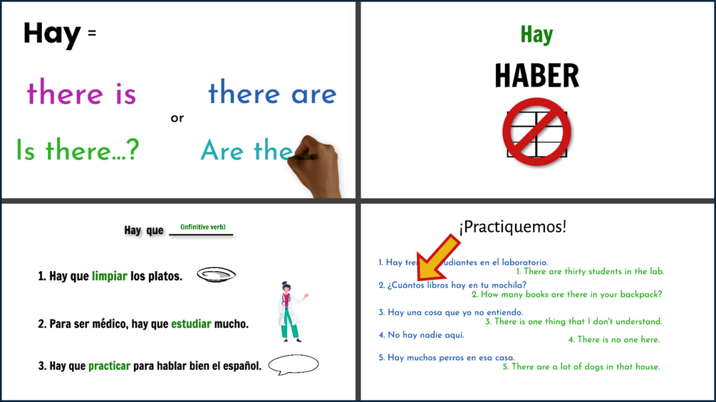 "Hay" is one of the smallest, quickest words to say in Spanish... and one of the most useful, too. Here we use a very visual lesson teach you how to pronounce it and use it, with lots of practice and examples as always.